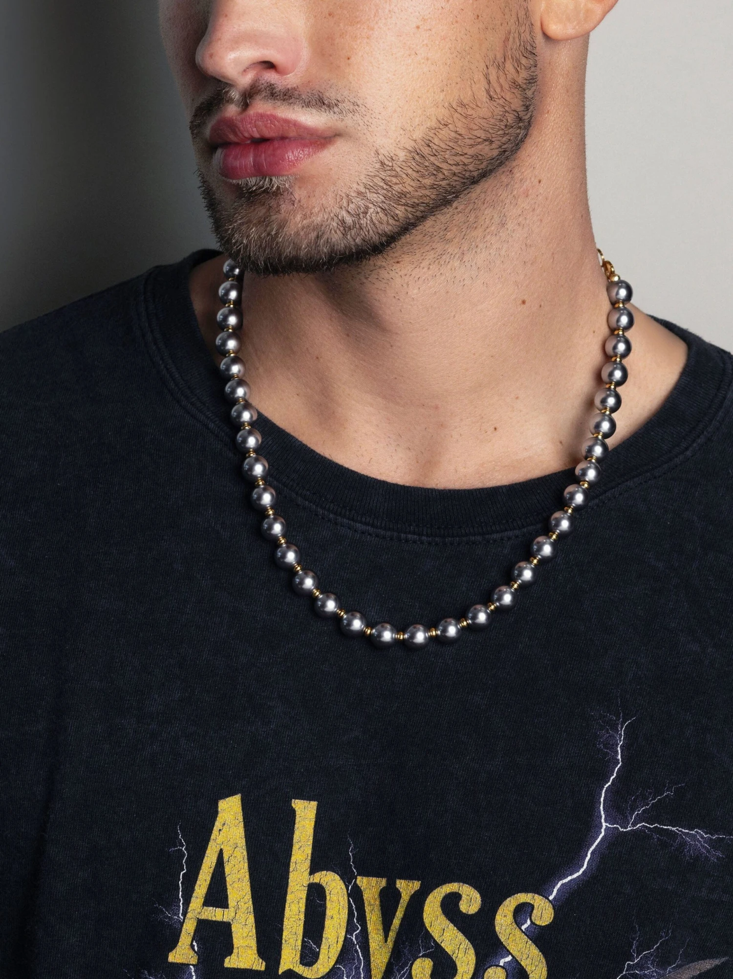 Strung by hand on a strong metal wire in our LA studio, this necklace features bold 10mm pearls in sleek metallic silver tones, accented with gold-plated beads and finished with a gold-plated lock. The contrasting tones create an edgy yet sophisticated accent to your style. Wear this striking piece solo or layered.