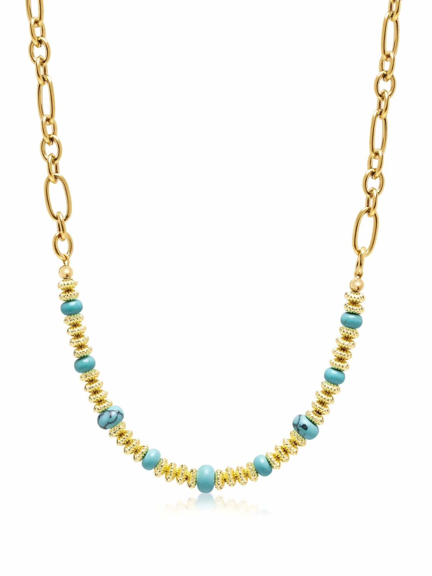 A bold mix of textures and tones. This choker combines sleek gold links with a strand of turquoise beads framed by textured gold spacers — bringing balance between raw earthiness and polished edge. Featuring two distinct chain styles, it’s a statement piece made to layer or stand alone.