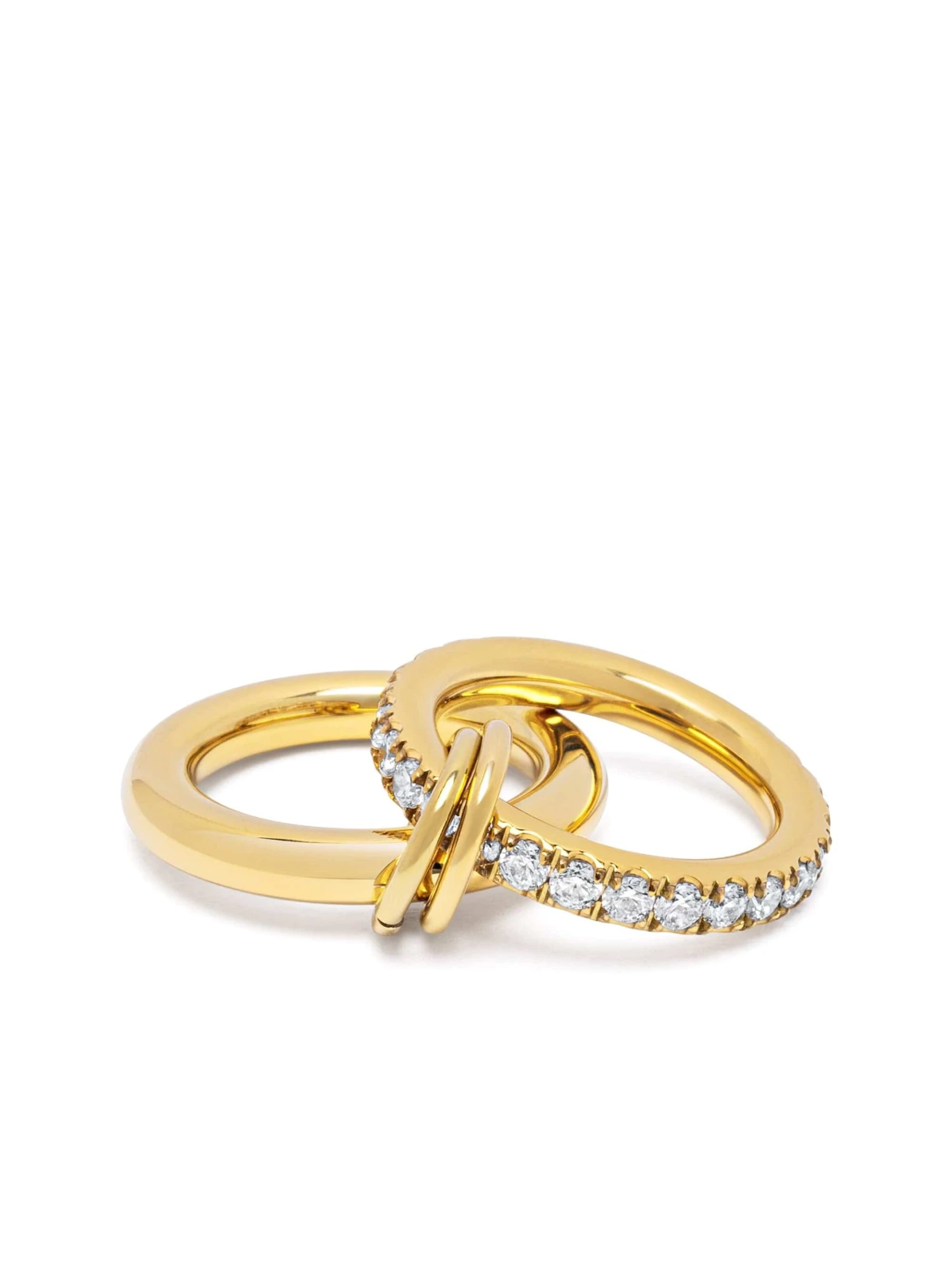 A sleek illusion with subtle edge — this double hoop ring gives the look of two separate bands, held together by a small connecting hoop for a unique twist. Crafted in stainless steel with gold plating and finished with clear CZ stones, it’s bold, durable, and made to shine from every angle.