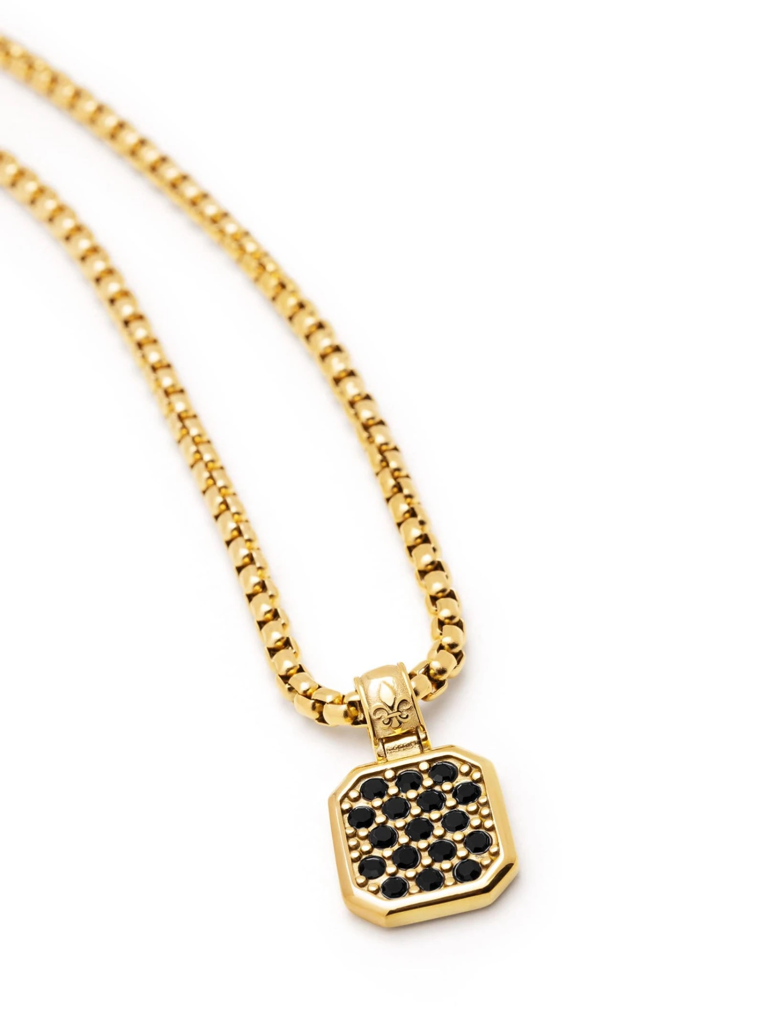 This modern necklace features brilliant black Cubic Zirconia diamonds. This piece was forged with stainless steel and plated with radiant gold, with the square pendant giving the overall piece a nice clean touch.