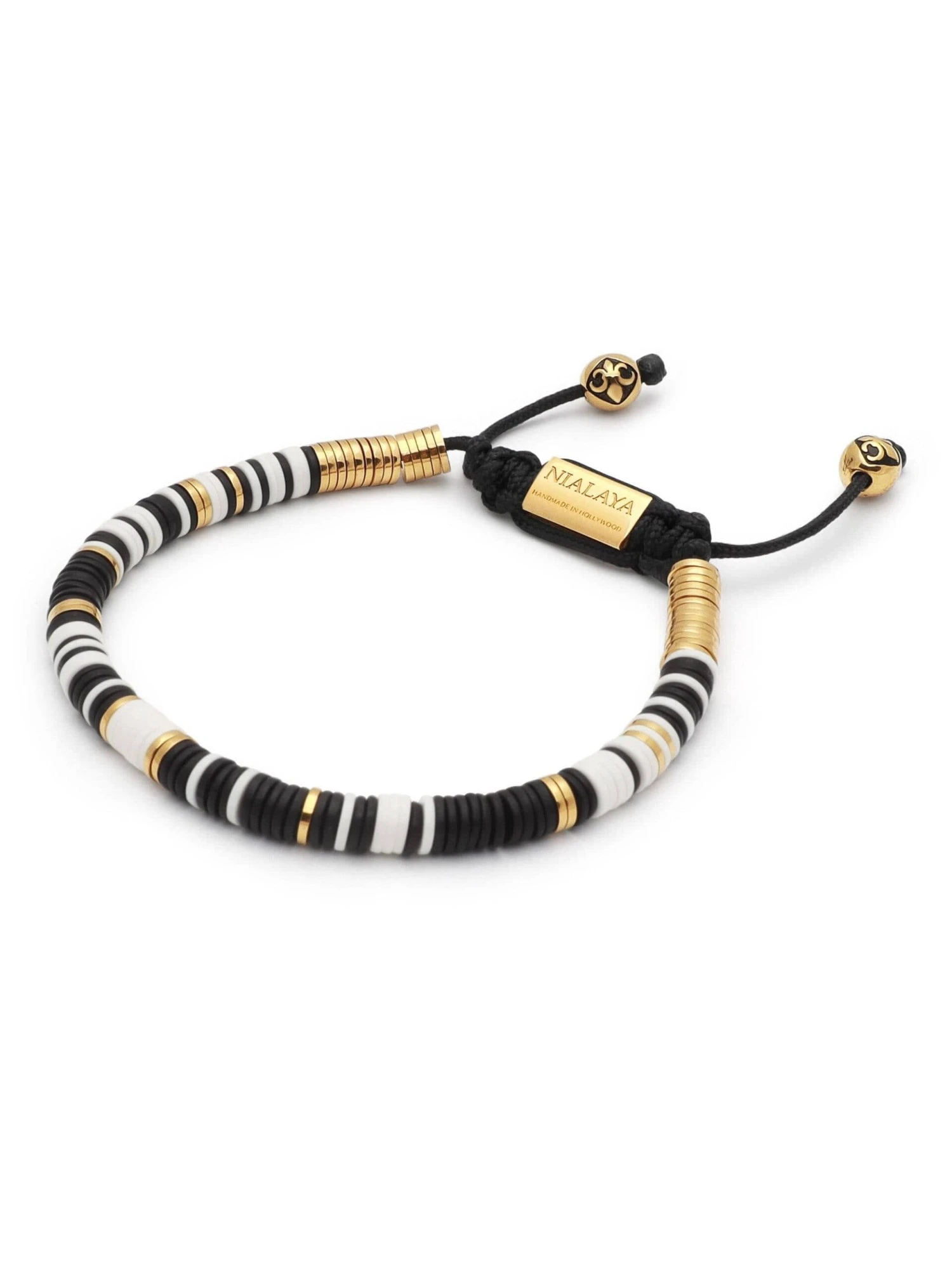 Our classic beaded bracelet is crafted by hand from a strong 100% nylon string and finished with a stainless steel drawstring lock. The bracelet opens by pulling the beads closest to the lock in opposite directions and closes by pulling the small, dangling gold beads in opposite directions.