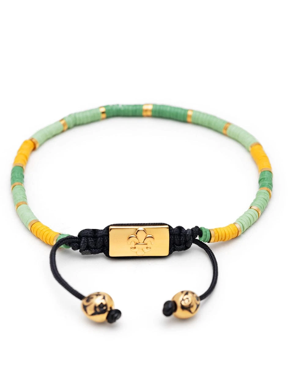 Our classic beaded bracelet is crafted by hand from a strong 100% nylon string and finished with a stainless steel drawstring lock. The bracelet opens by pulling the beads closest to the lock in opposite directions and closes by pulling the small, dangling gold beads in opposite directions.