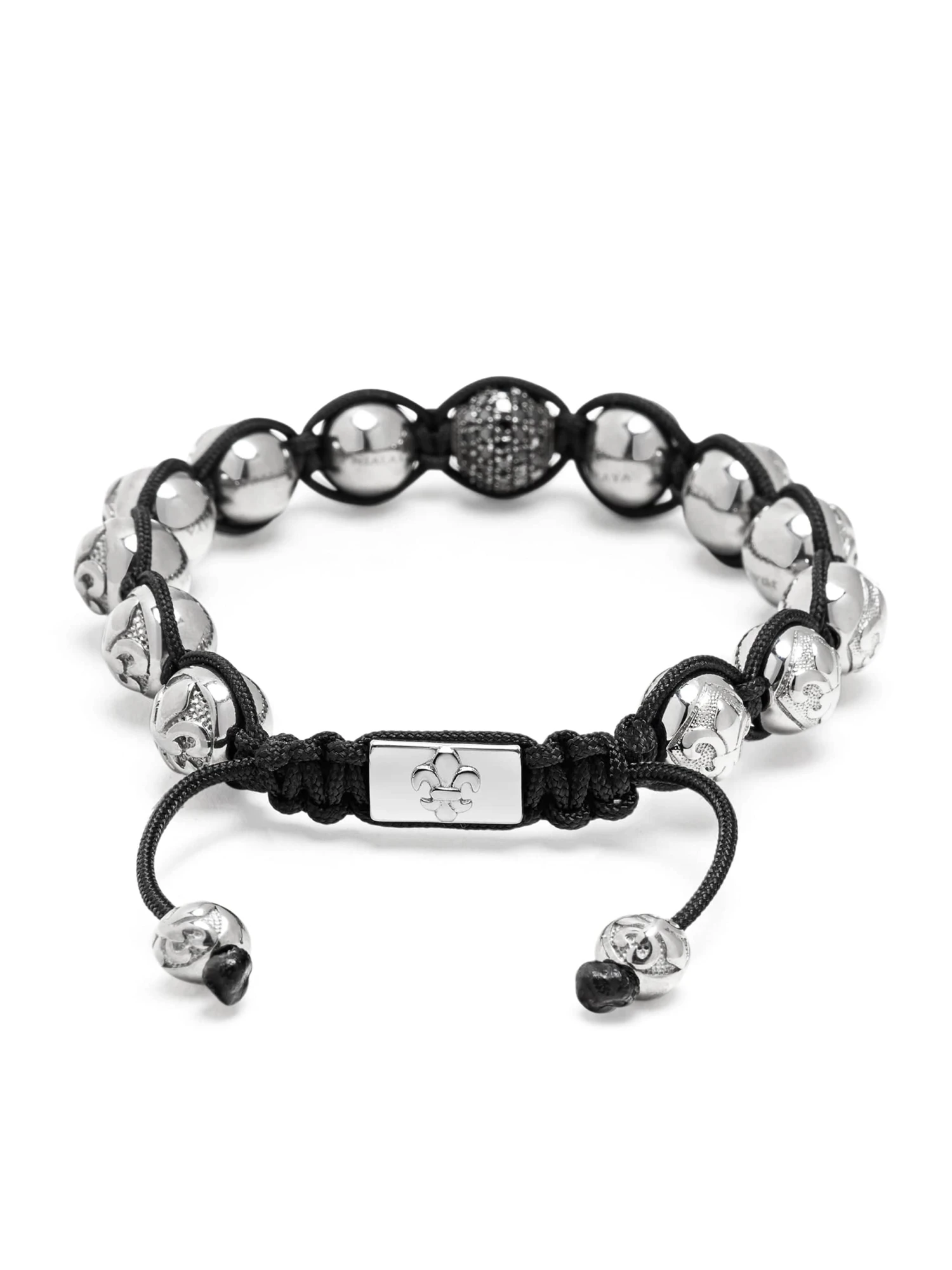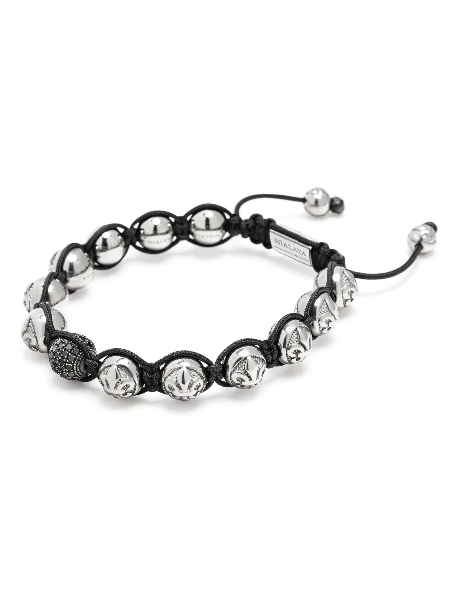 Our classic beaded bracelet is crafted by hand from a strong 100% nylon string and finished with a stainless steel drawstring lock. The bracelet opens by pulling the beads closest to the lock in opposite directions and closes by pulling the small, dangling silver beads in opposite directions.