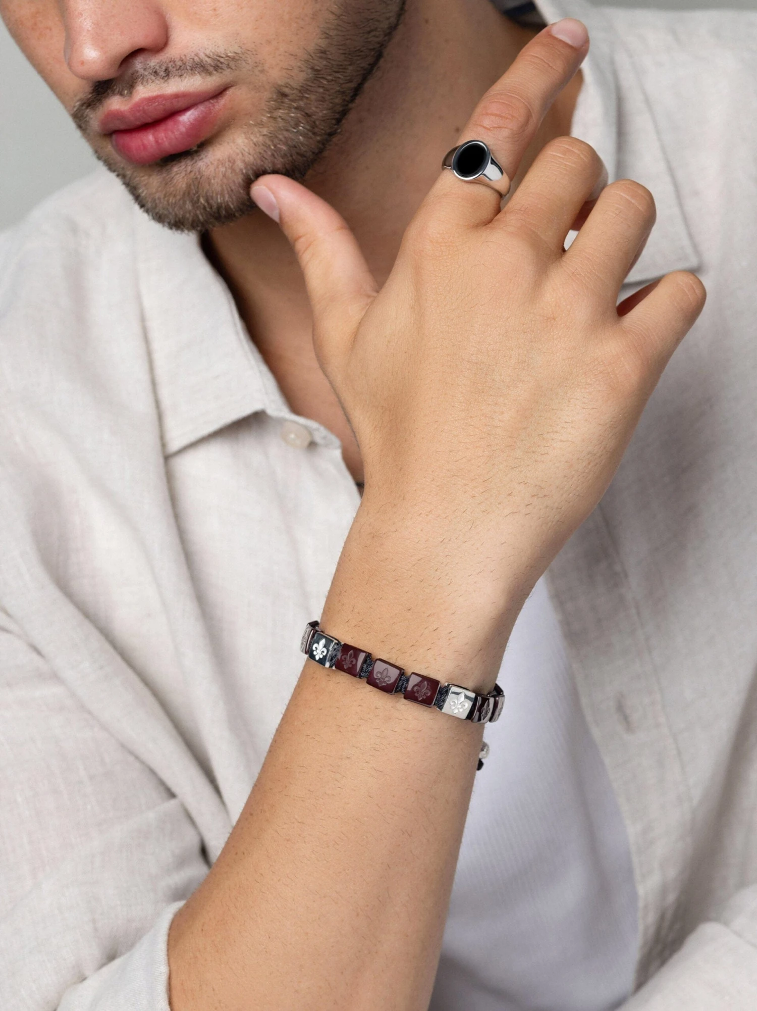 This handcrafted, one-of-a-kind bracelet features dark red handmade ceramic beads, paired with 925 sterling silver flatbeads for a striking contrast. The deep red hue of the ceramic beads adds warmth and richness, while the sterling silver flatbeads offer a touch of elegance. Perfect for stacking, this bracelet can be layered with thinner silver pieces for a modern, sophisticated look.