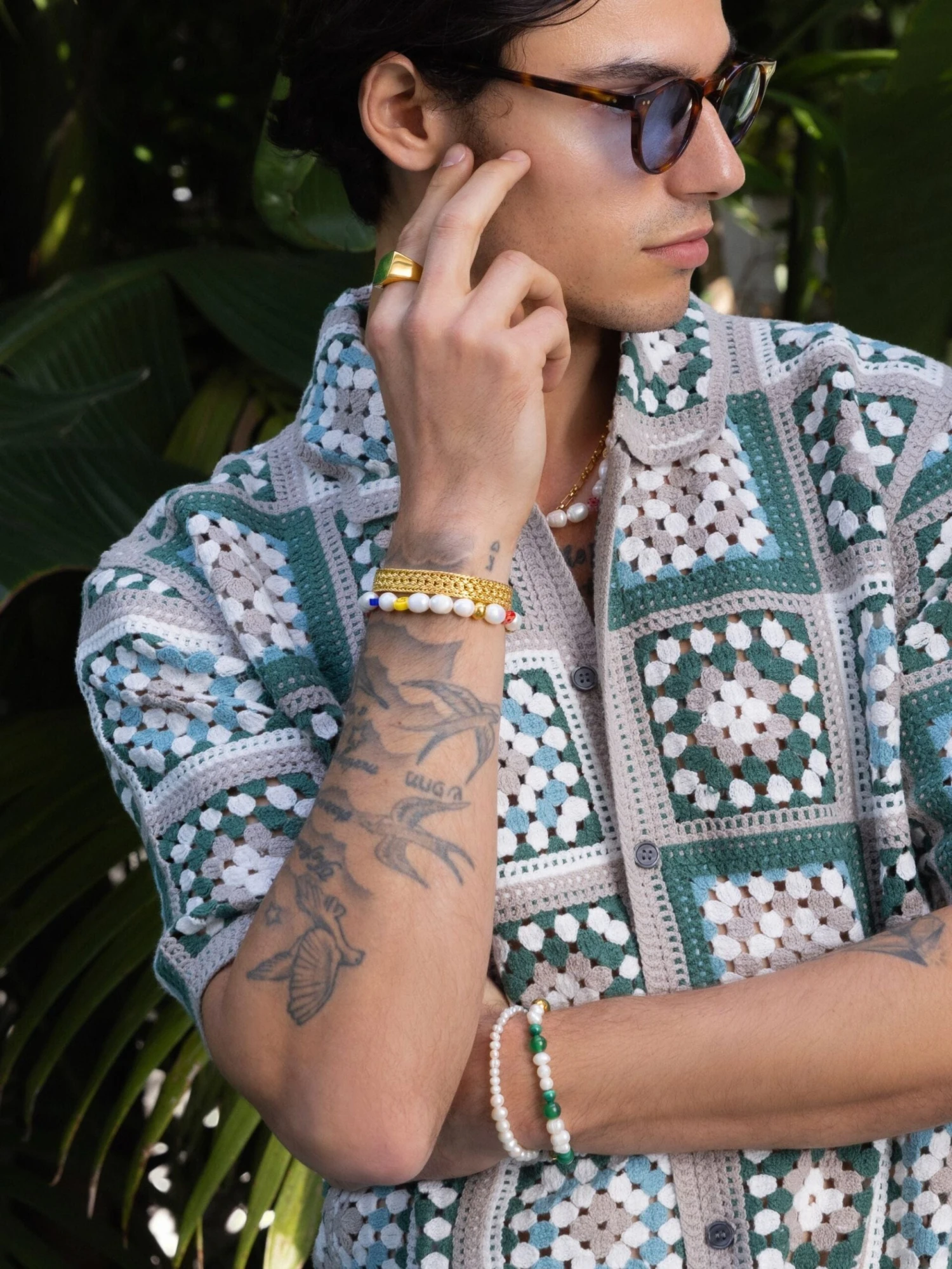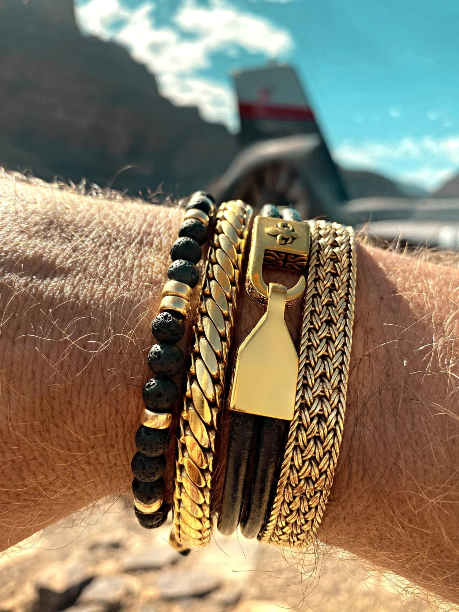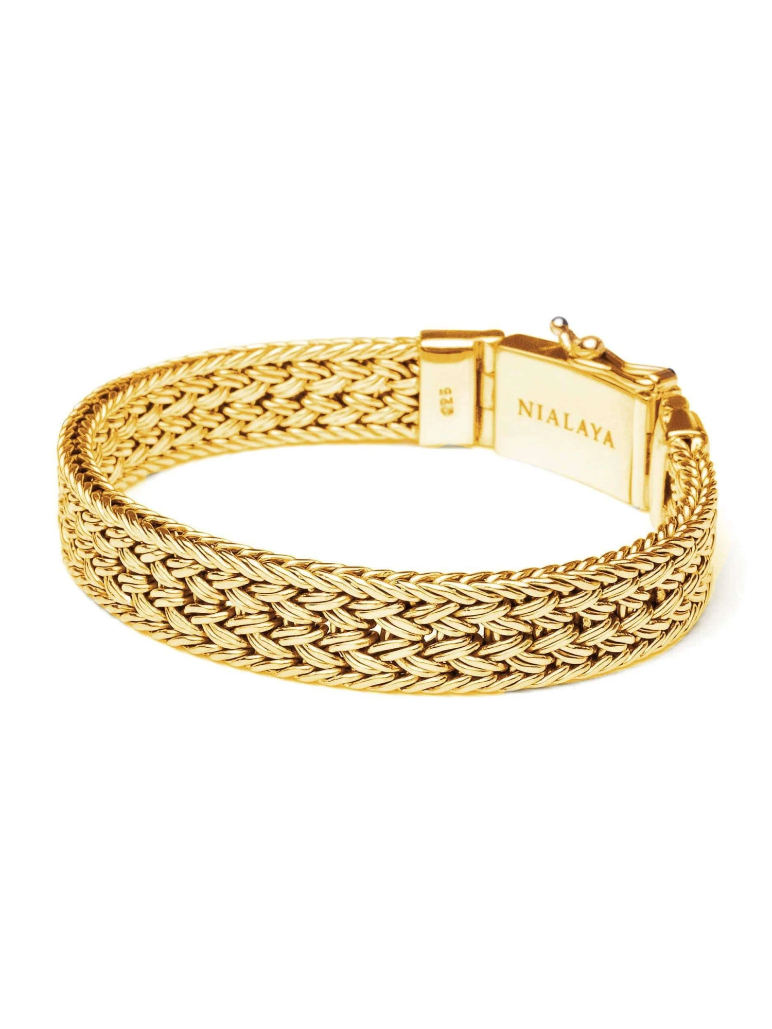 This handcrafted masterpiece is made of gold-plated, braided 925 Sterling Silver strands. The elegant clasp features our engraved Nialaya logo and an easy to open clasp. This piece can be worn on its own or stacked with smaller pieces in our collection. Try combining it with our colorful beaded bracelets for a unique look.