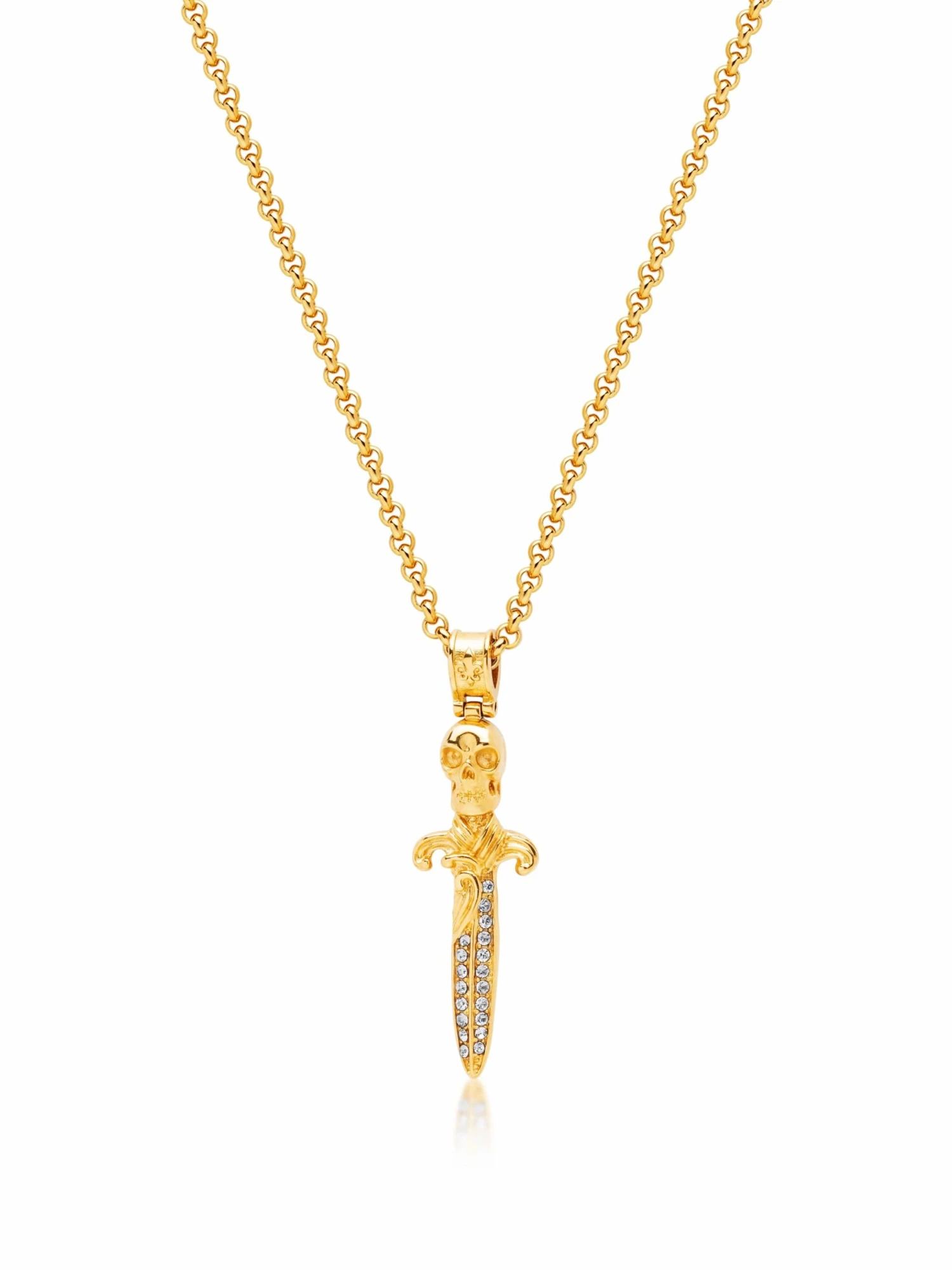 Crafted by hand with meticulous attention to detail, this one-of-a-kind necklace features a skull, sitting on top of a CZ studded sword blade. Carefully placed CZ stones are adding layers of elegance and sophistication. Wear it layered with other chains to complete your look.