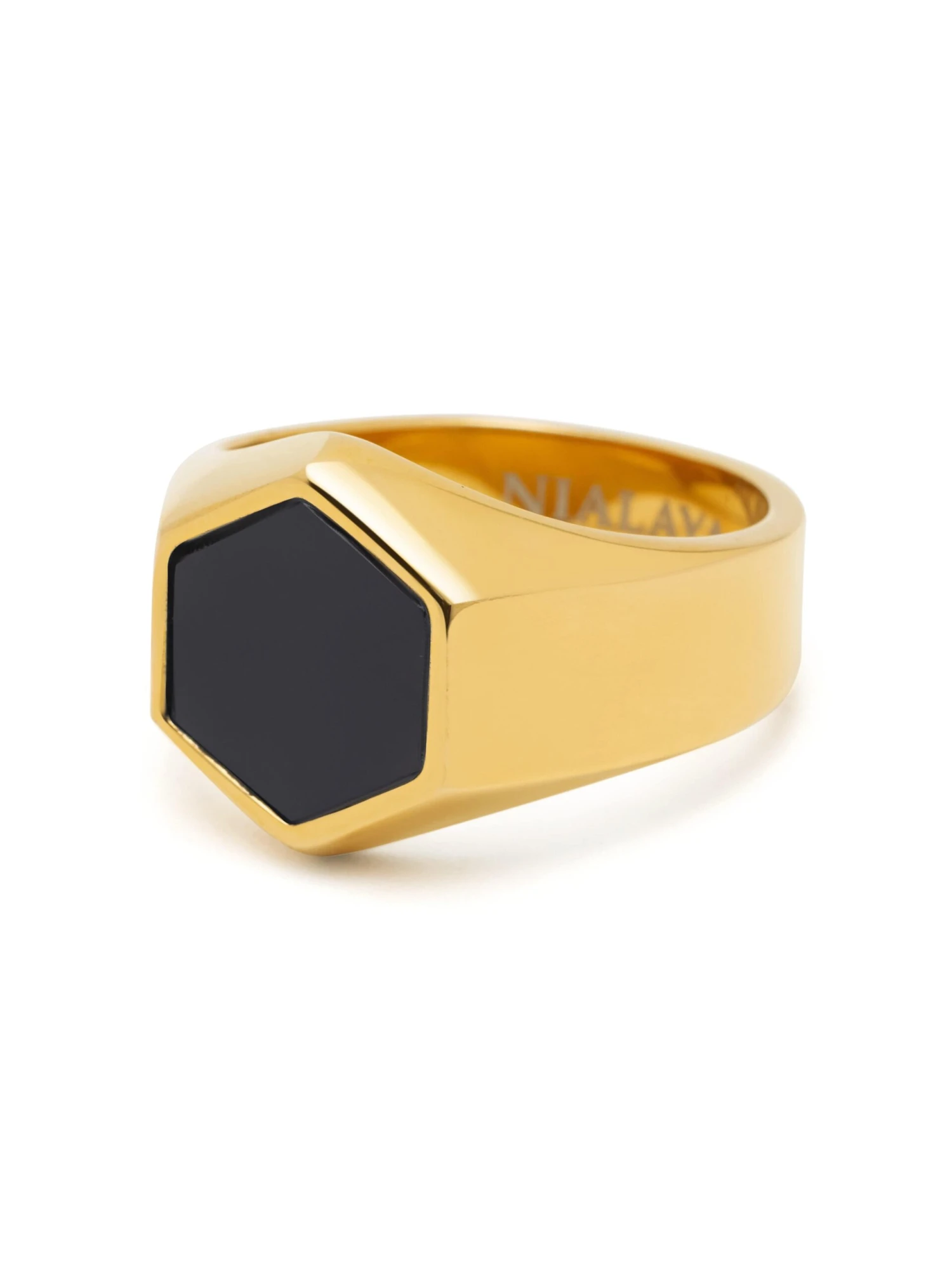 This ring is designed with a beautiful black onyx. The Hexagon shape gives this ring a special twist. Wear it with other gold rings for a cool stacked look.