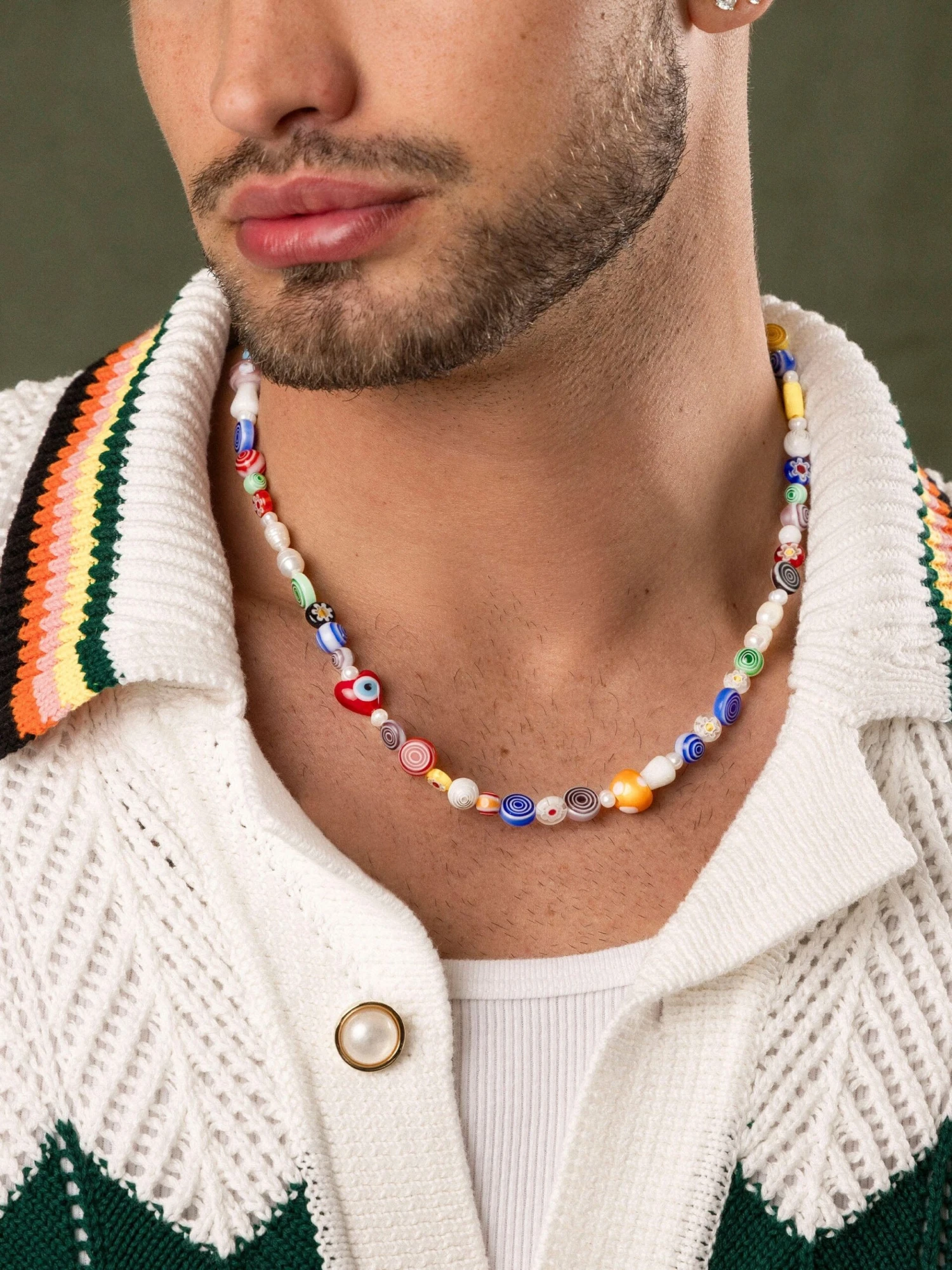 Strung by hand on a strong metal wire in our LA studio, this necklace with colorful glass beads and large pearls will add a unique touch to all your looks. Wear this stunning piece solo or layered.