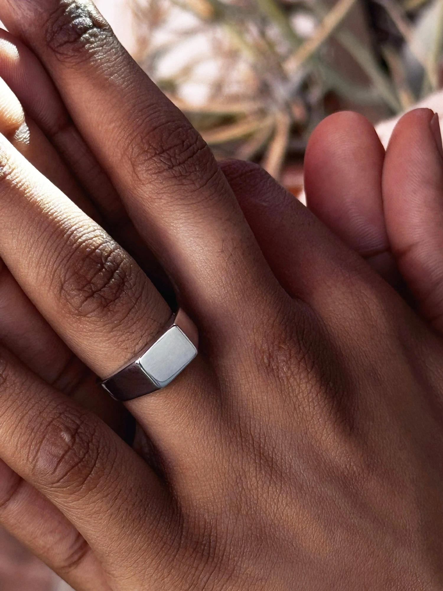 Discover the epitome of elegance with Nialaya’s exquisite men’s signet ring, a captivating creation that seamlessly blends craftsmanship and style. Handmade with precision from high-quality 925 sterling silver and luxuriously rhodium plated, this beautiful lightweight ring is an ideal gift for him. The Rectangular Signet Ring stands out with its modern interpretation of the classic signet ring, featuring a sleek rectangular bezel that adds a touch of sophistication to any look. Embrace the contemporary allure of this Sterling Silver Signet Ring—a timeless piece that transcends tradition with its refined design. Elevate his style and celebrate the artistry of handcrafted jewelry with this exceptional ring.