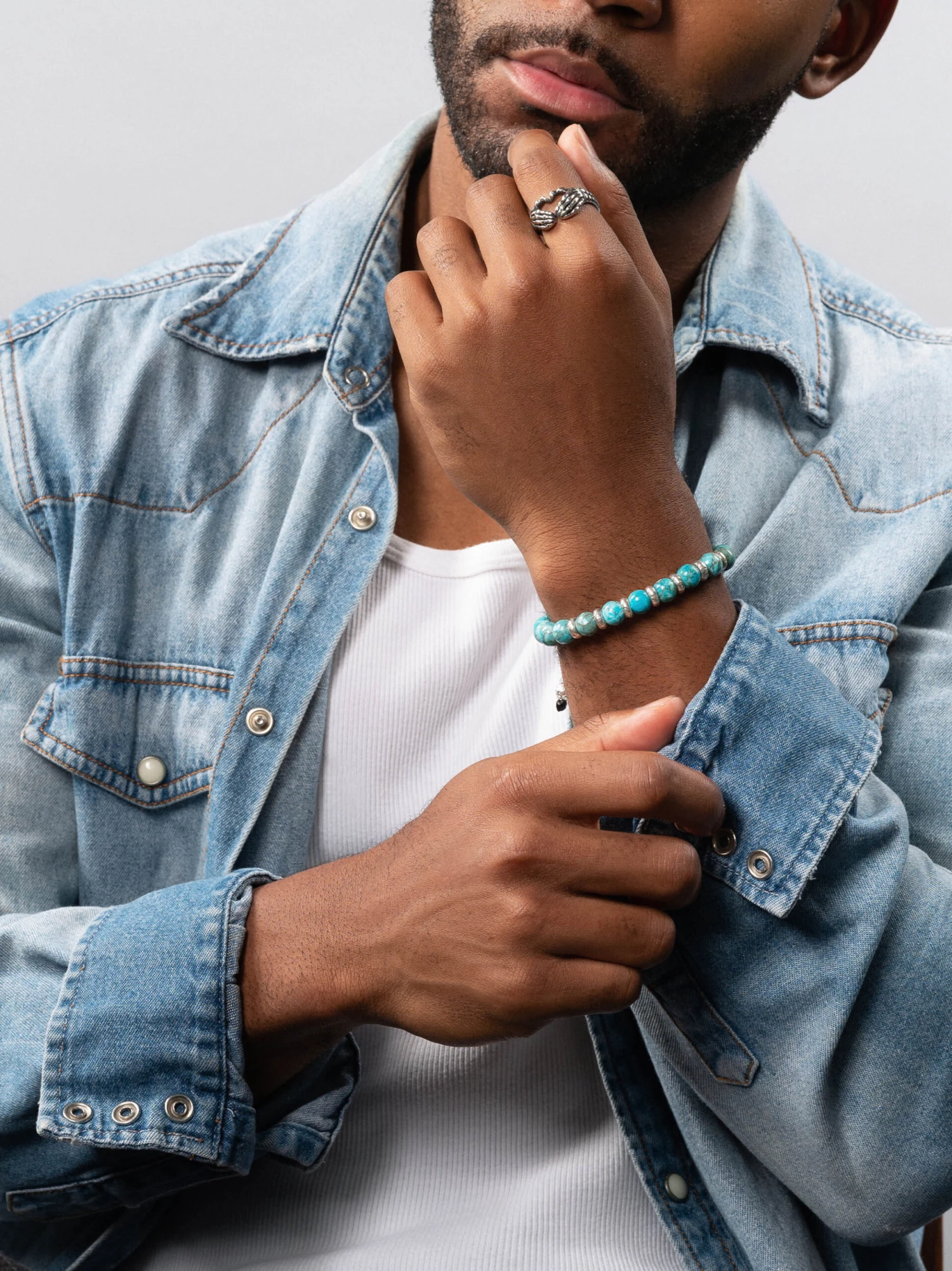 This bracelet combines sterling silver beads with vibrant turquoise, creating a striking contrast of cool tones. The smooth silver enhances the bold, natural hue of the turquoise, offering a fresh, effortless look. Ideal for adding a pop of color, it’s a versatile piece that pairs easily with any style.