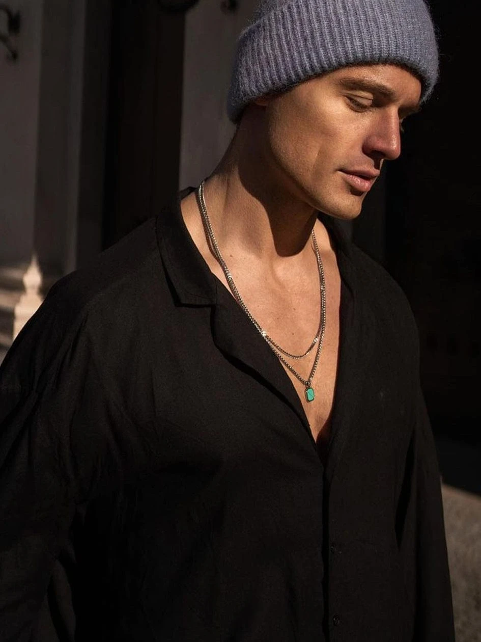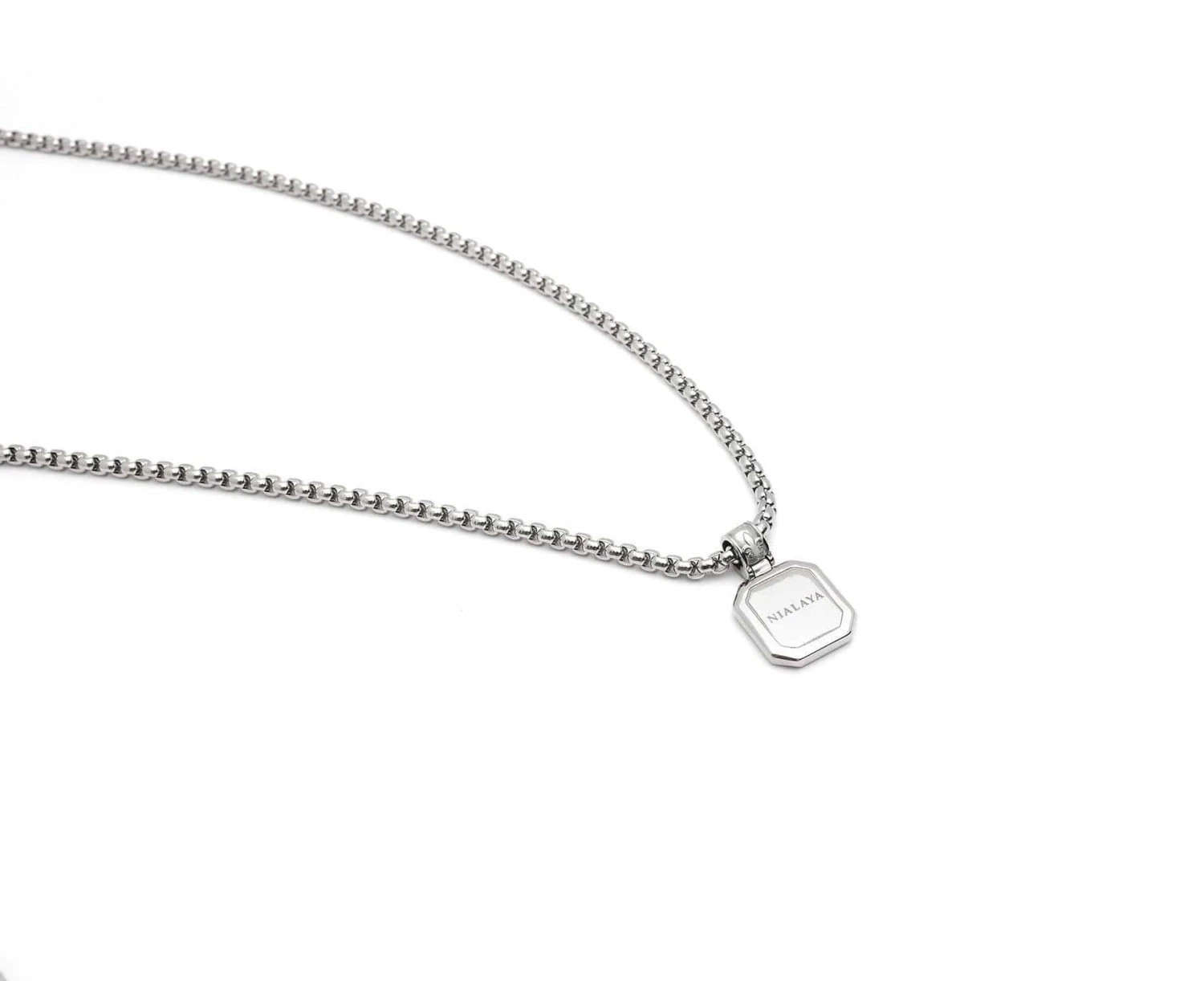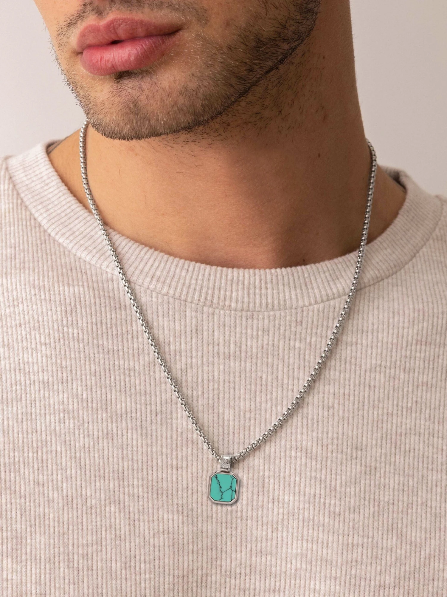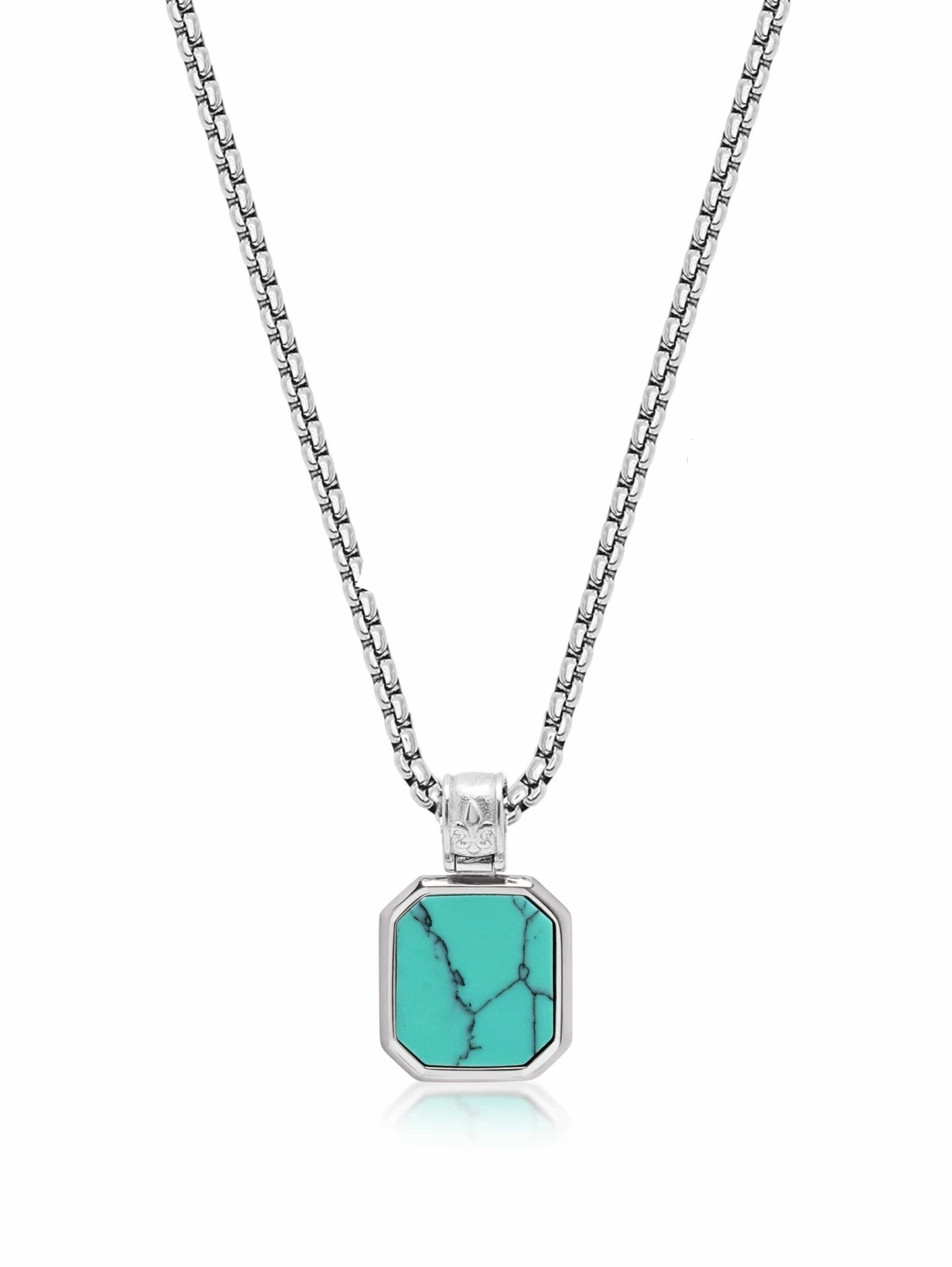 Inspired by the lighter and brighter palette of the natural waters around the world, this modern necklace features a brilliant Turquoise, giving the wearer personal strength, protection from harm, psychic sensitivity, and connection to the spirit world. This piece was forged with stainless steel and finished with radiant silver, with the square pendant giving the overall piece a nice clean touch.
