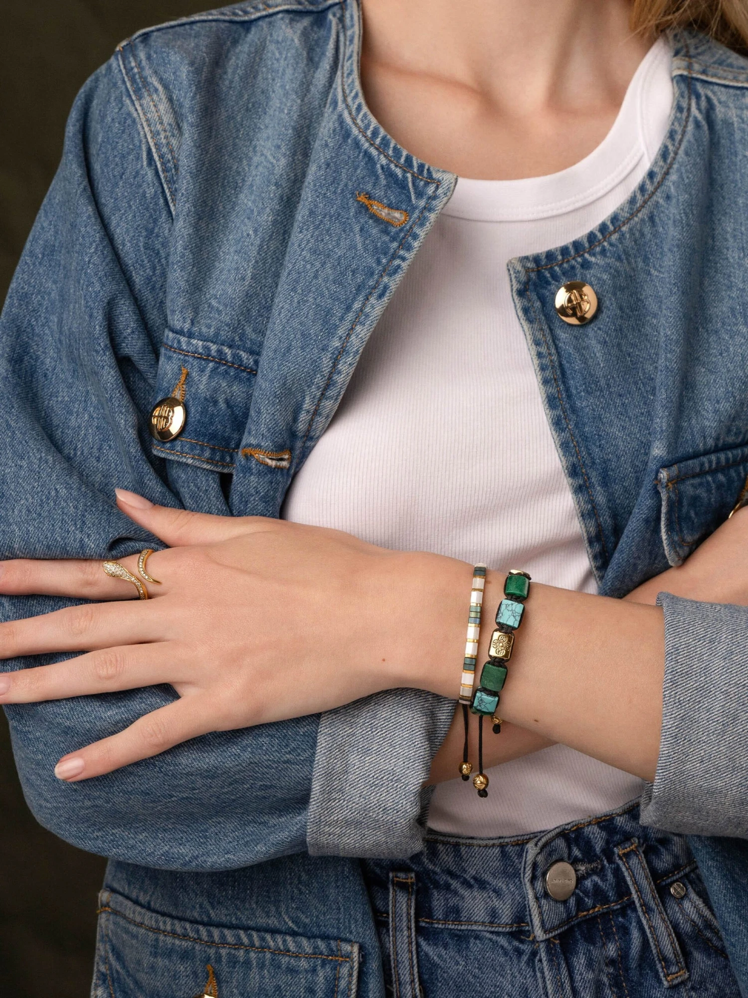 The white beads symbolize purity, the patina green adds a touch of nature’s tranquility, and the gold accents bring a touch of opulence. The bracelet is a harmonious blend of colors that seamlessly transitions from day to night, offering versatility and charm.