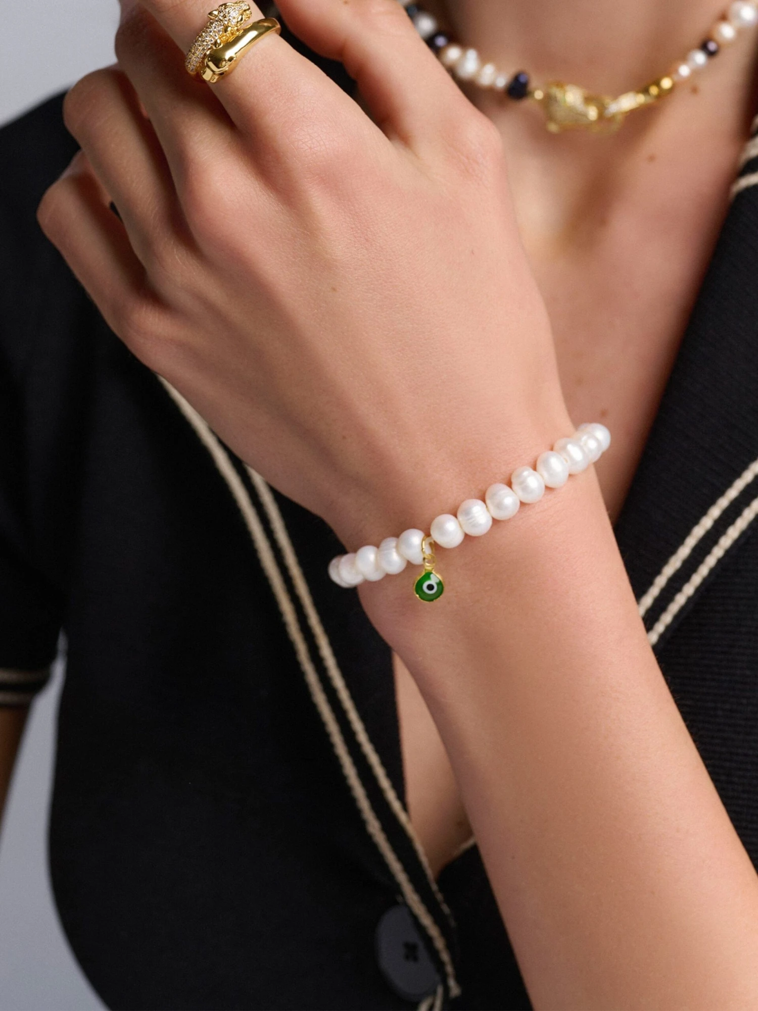 Strung by hand from elegant white freshwater pearls, this stunning piece is adorned with a delicate green evil eye pendant. Wear this beauty solo or stacked. We use cultured pearls from oysters and freshwater mussels, each selected by hand for our jewelry.